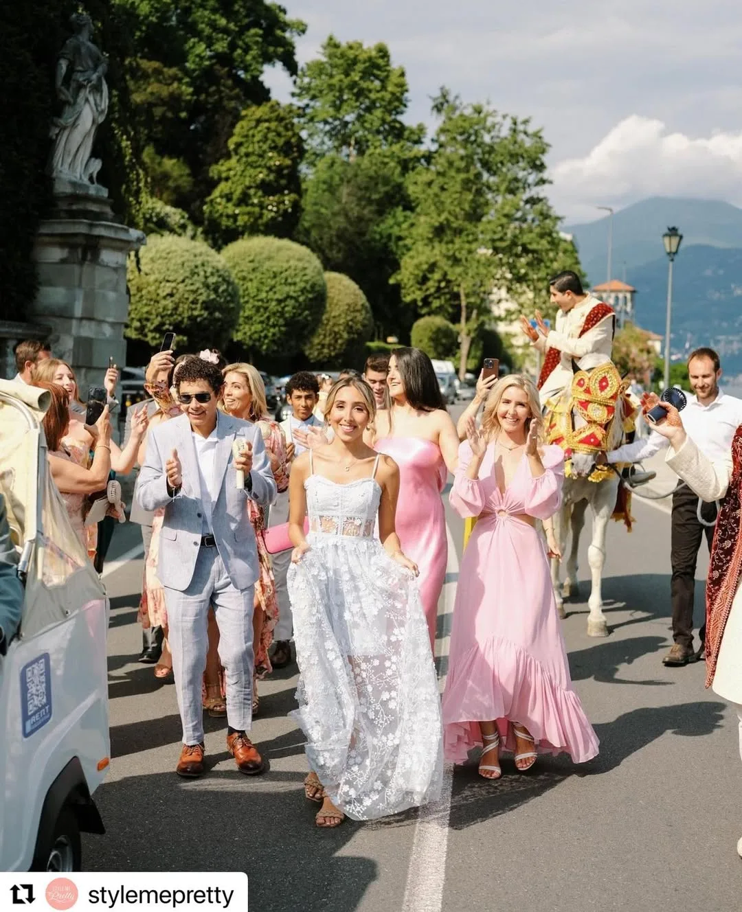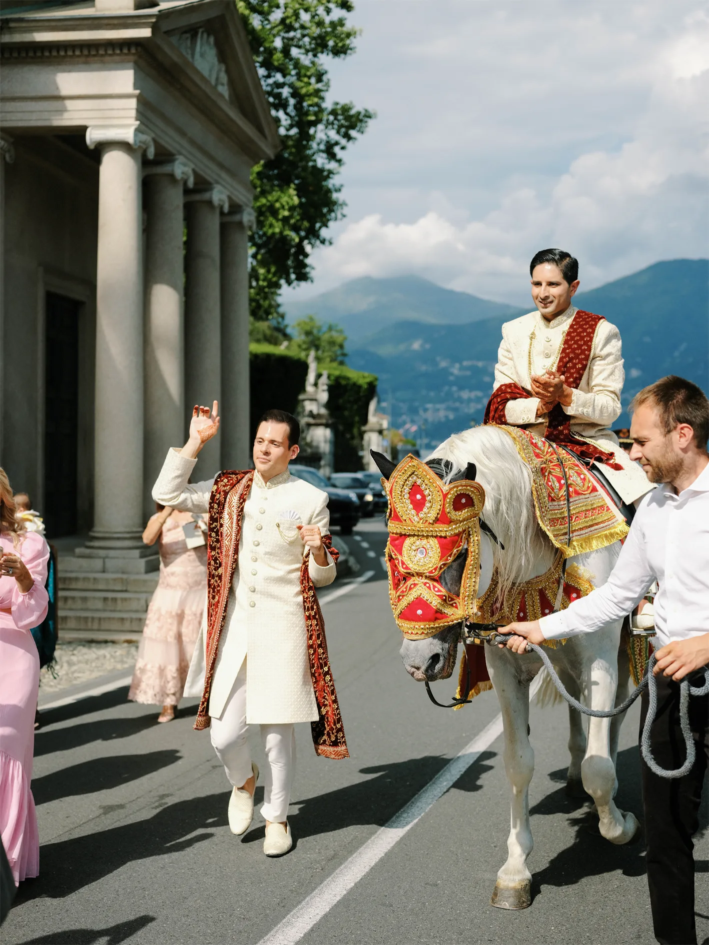 One of the spouses entered on horseback during a traditional Indian Barat ceremony, as the busiest road on Lake Como was closed for 30 minutes and escorted by local police.